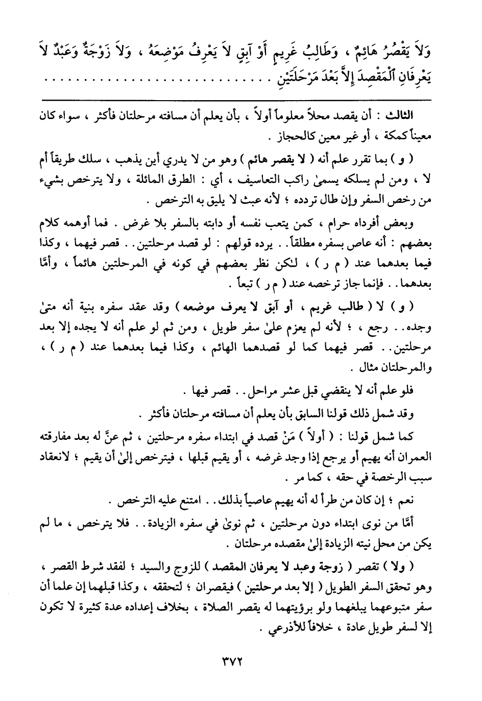 كما شمل قولنا: (أولاً) مَنْ قصد في ابتداء سفره مرحلتين، ثم عنَّ له بعد مفارقته العمران أنه يهيم أو يرجع إذا وجد غرضه، أو يقيم قبلها، فيترخص إلى أن يقيم؛ لانعقاد سبب الرخصة في حقه، كما مر.