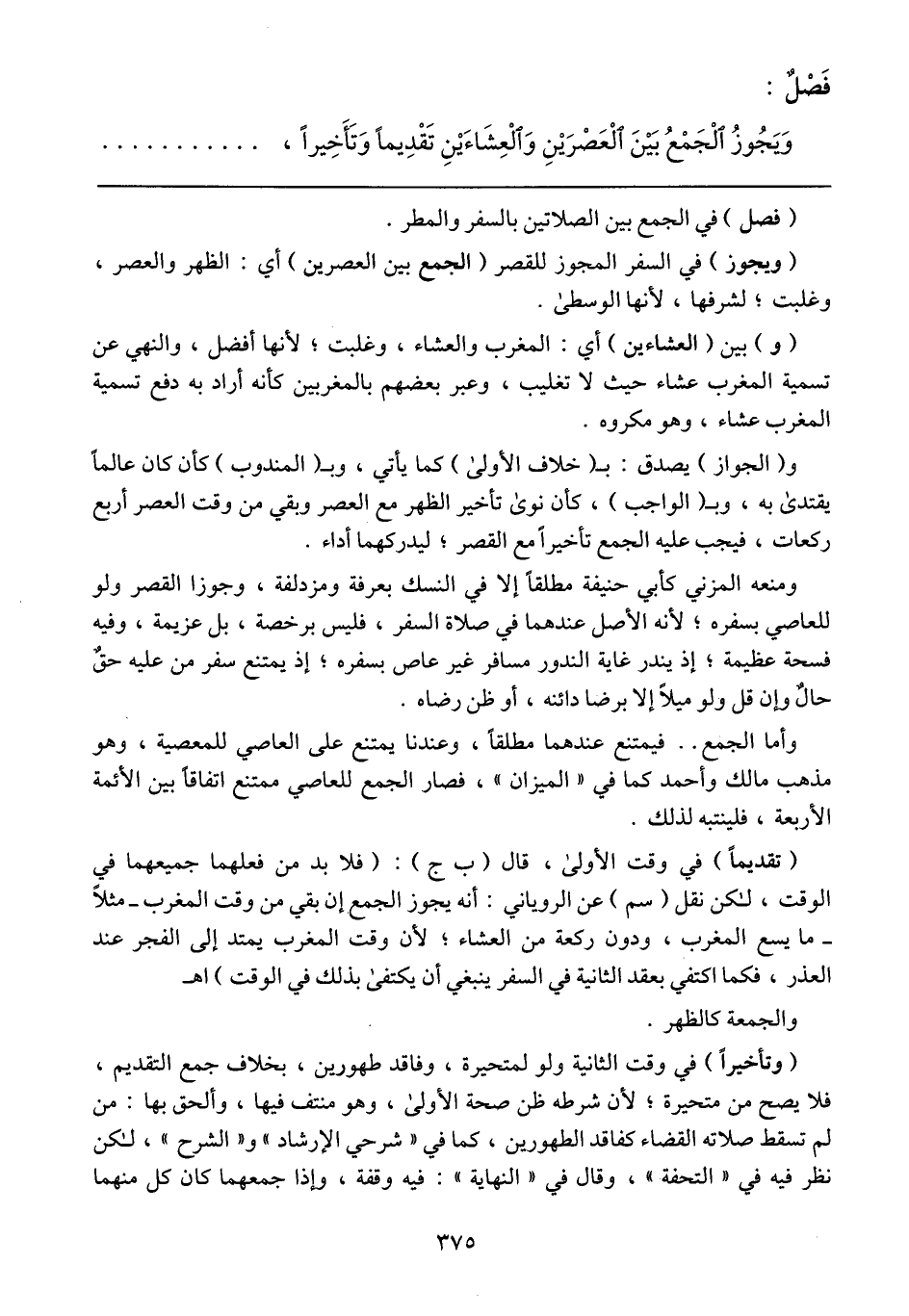 وأما الجمع .. فيمتنع عندهما مطلقاً، وعندنا يمتنع على العاصي للمعصية، وهو مذهب مالك وأحمد كما في "الميزان"، فصار الجمع للعاصي ممتنع اتفاقاً بين الأئمة الأربعة، فلينتبه لذلك.