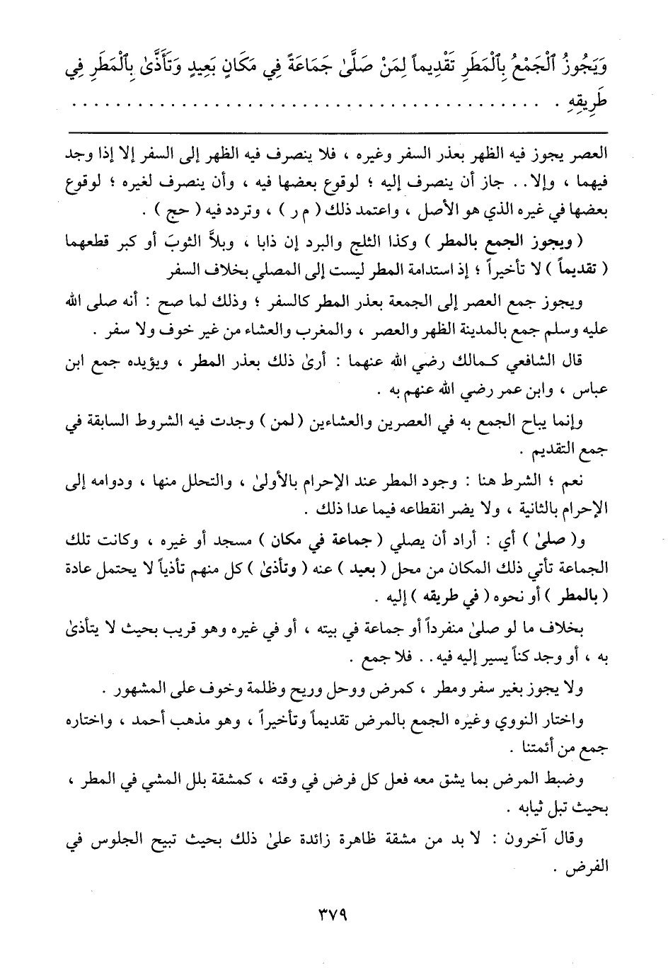 قال الشافعي كمالك رضي الله عنهما: أرى ذلك بعذر المطر، ويؤيده جمع ابن عباس، وابن عمر رضي الله عنهم به.