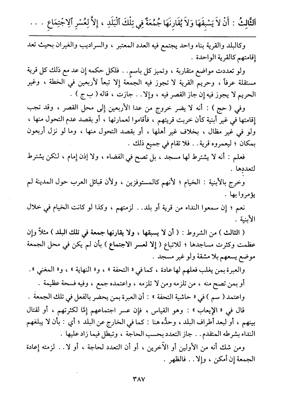 (الثالث) من الشروط: (أن لا يسبقها، ولا يقارنها جمعة في تلك البلد) مثلاً وإن عظمت وكثرت مساجدها؛ للاتباع (إلا لعسر الاجتماع) بأن لم يكن في محل الجمعة موضع يسعهم بلا مشقة ولو غير مسجد.