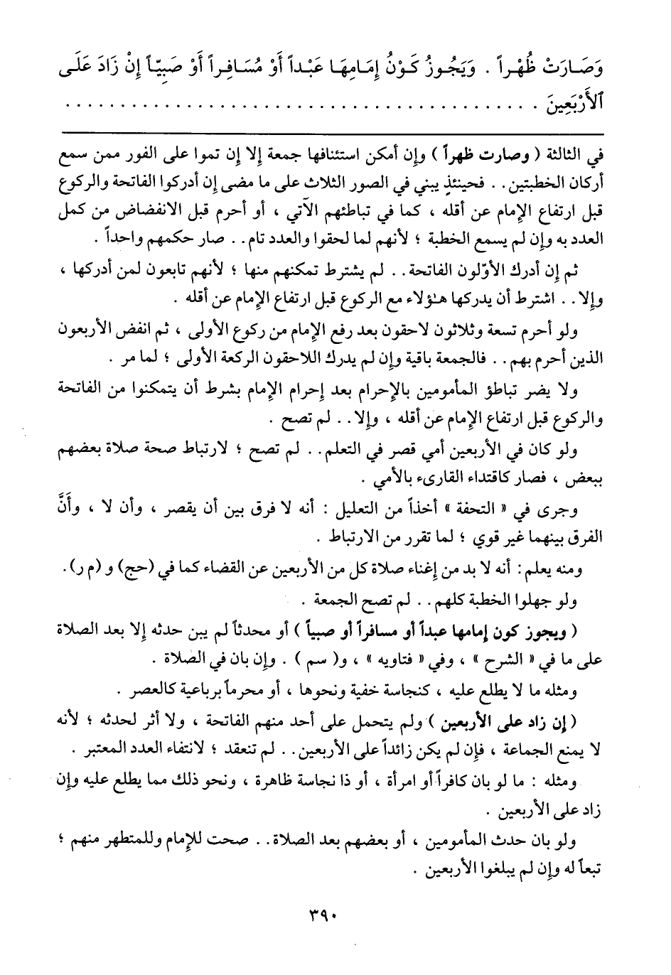 في الثالثة (وصارت ظهراً) وإن أمكن استئنافها جمعة إلا إن تموا على الفور ممن سمع أركان الخطبتين .. فحينئذٍ يبني في الصور الثلاث على ما مضى إن أدركوا الفاتحة والركوع قبل ارتفاع الإمام عن أقله، كما في تباطئهم الآتي، أو أحرم قبل الانفضاض من كمل العدد به وإن لم يسمع الخطبة؛ لأنهم لما لحقوا والعدد تام .. صار حكمهم واحداً.