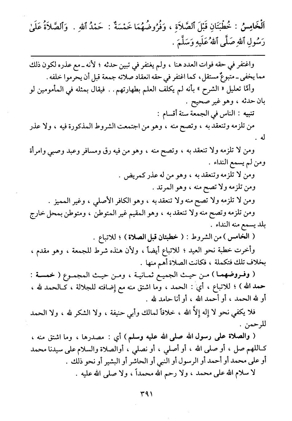 (وفروضهما) من حيث الجميع ثمانية، ومن حيث المجموع (خمسة: حمد الله)؛ للاتباع، أي: الحمد، وما اشتق منه مع إضافته للجلالة، كالحمد لله، أو لله الحمد، أو أحمد الله، أو أنا حامد لله.