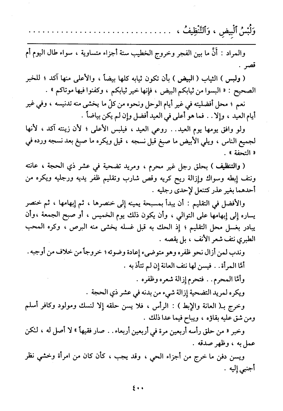 (ولبس) الثياب (البيض) بأن تكون ثيابه كلها بيضاء، والأعلى منها آكد؛ للخبر الصحيح: "البسوا من ثيابكم البيض، فإنها خير ثيابكم، وكفنوا فيها موتاكم".