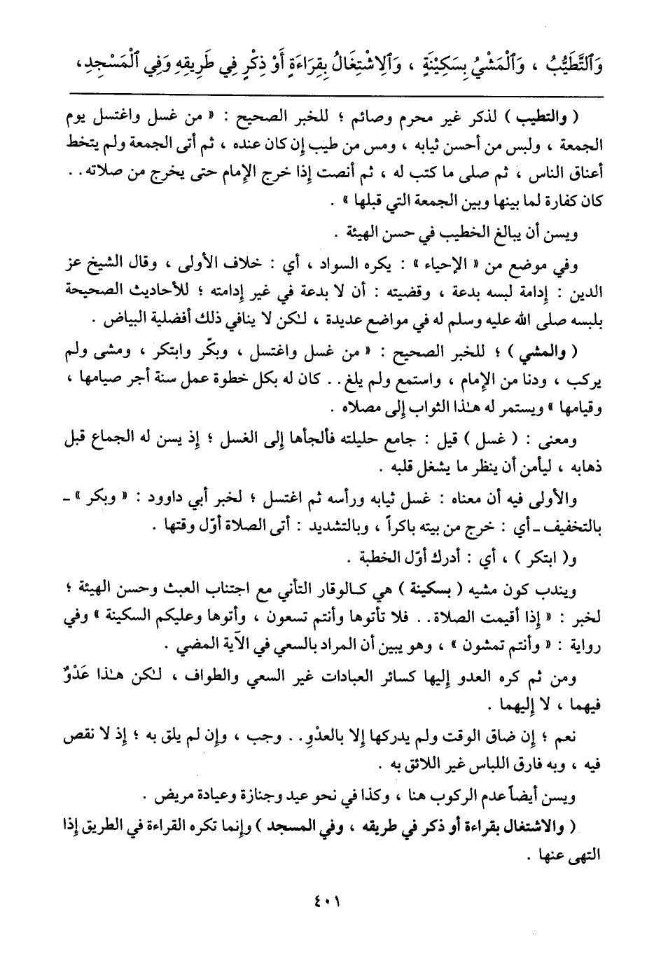 (والمشي)؛ للخبر الصحيح: "من غسل واغتسل، وبكّر وابتكر، ومشى ولم يركب، ودنا من الإمام، واستمع ولم يلغ .. كان له بكل خطوة عمل سنة أجر صيامها، وقيامها" ويستمر له هذا الثواب إلى مصلاه.