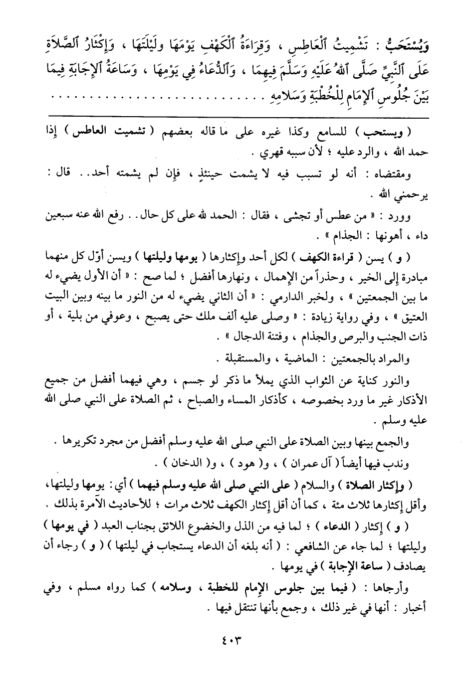 (وإكثار الصلاة) والسلام (على النبي صلى الله عليه وسلم فيهما) أي: يومها وليلتها، وأقل إكثارها ثلاث مئة، كما إن أقل إكثار الكهف ثلاث مرات؛ للأحاديث الآمرة بذلك.