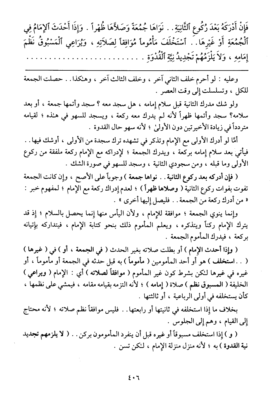 ولو شك مدرك الثانية قبل سلام إمامه هل سجد معه؟ سجد وأتمها جمعة، أو بعد سلامه؟ سجد وأتمها ظهراً؛ لأنه لم يدرك معه ركعة، ويسجد للسهو في هذه؛ لقيامه متردداً في زيادة الأخيرتين دون الأولى؛ لأنه سهو حال القدوة.