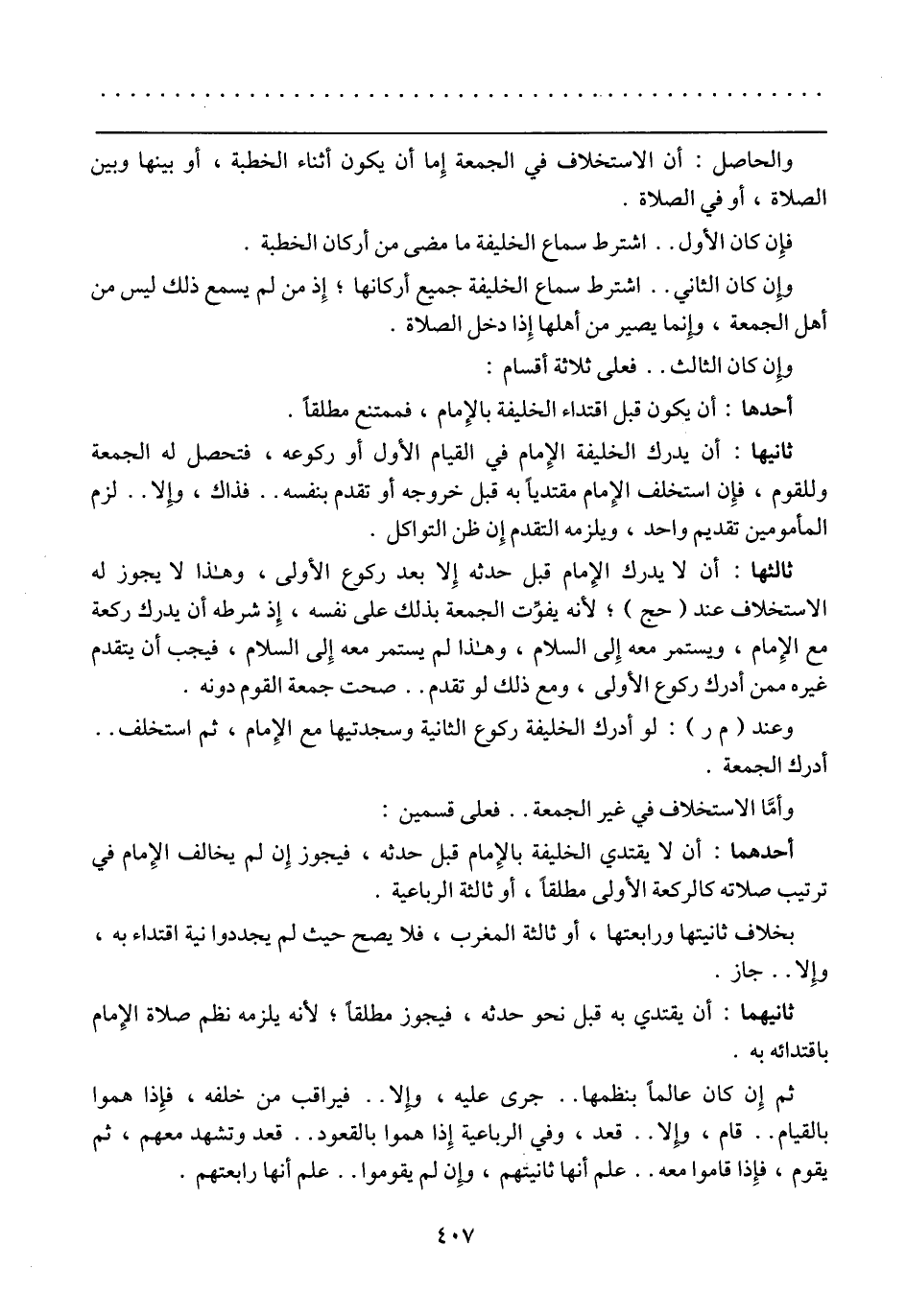 ثالثها: أن لا يدرك الإمام قبل حدثه إلا بعد ركوع الأولى، وهذا لا يجوز له الاستخلاف عند (حج)؛ لأنه يفوِّت الجمعة بذلك على نفسه، إذ شرطه إن يدرك ركعة مع الإمام، ويستمر معه إلى السلام، وهذا لم يستمر معه إلى السلام، فيجب إن يتقدم غيره ممن أدرك ركوع الأولى، ومع ذلك لو تقدم .. صحت جمعة القوم دونه.