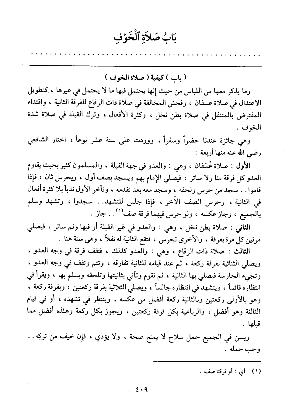 الأول: صلاة عُسْفان، وهي: والعدو في جهة القبلة، والمسلمون كثير بحيث يقاوم العدو كل فرقة منا ولا ساتر، فيصلي الإمام بهم ويسجد بصف أول، ويحرس ثان، فإذا قاموا .. سجد من حرس ولحقه، وسجد معه بعد تقدمه، وتأخر الأول ندباً بلا كثرة أفعال في الثانية، وحرس الصف الآخر، فإذا جلس للتشهد .. سجدوا، وتشهد وسلم بالجميع، وجاز عكسه، ولو حرس فيهما فرقة صف .. جاز.