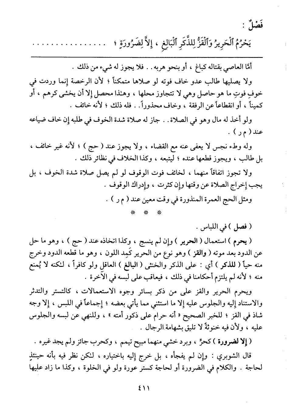 (إلا لضرورة) كحرٍّ، وبرد خشي منهما مبيح التيمم، وكحرب جائز ولم يجد غيره. قال الشوبري: وإن لم يفجأه، بل خرج إليه باختياره، لكن نظر فيه بأنه حينئذٍ لحاجة. والكلام في الضرورة أو لحاجة كستر عورة ولو في الخلوة، وكذا ما زاد عليها