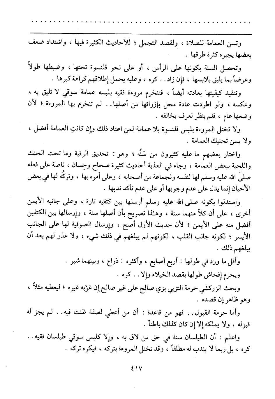 وتسن العمامة للصلاة، ولقصد التجمل؛ للأحاديث الكثيرة فيها، واشتداد ضعف بعضها يجبره كثرة طرقها.