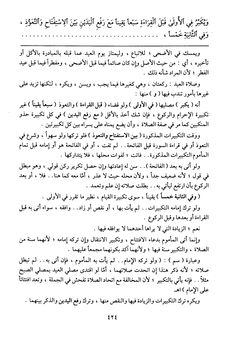 وصلاة العيد: ركعتان، وهي كغيرها فيما يجب، ويسن، ويكره لكنها تزيد على غيرها بأمور تندب فيها (و) منها: