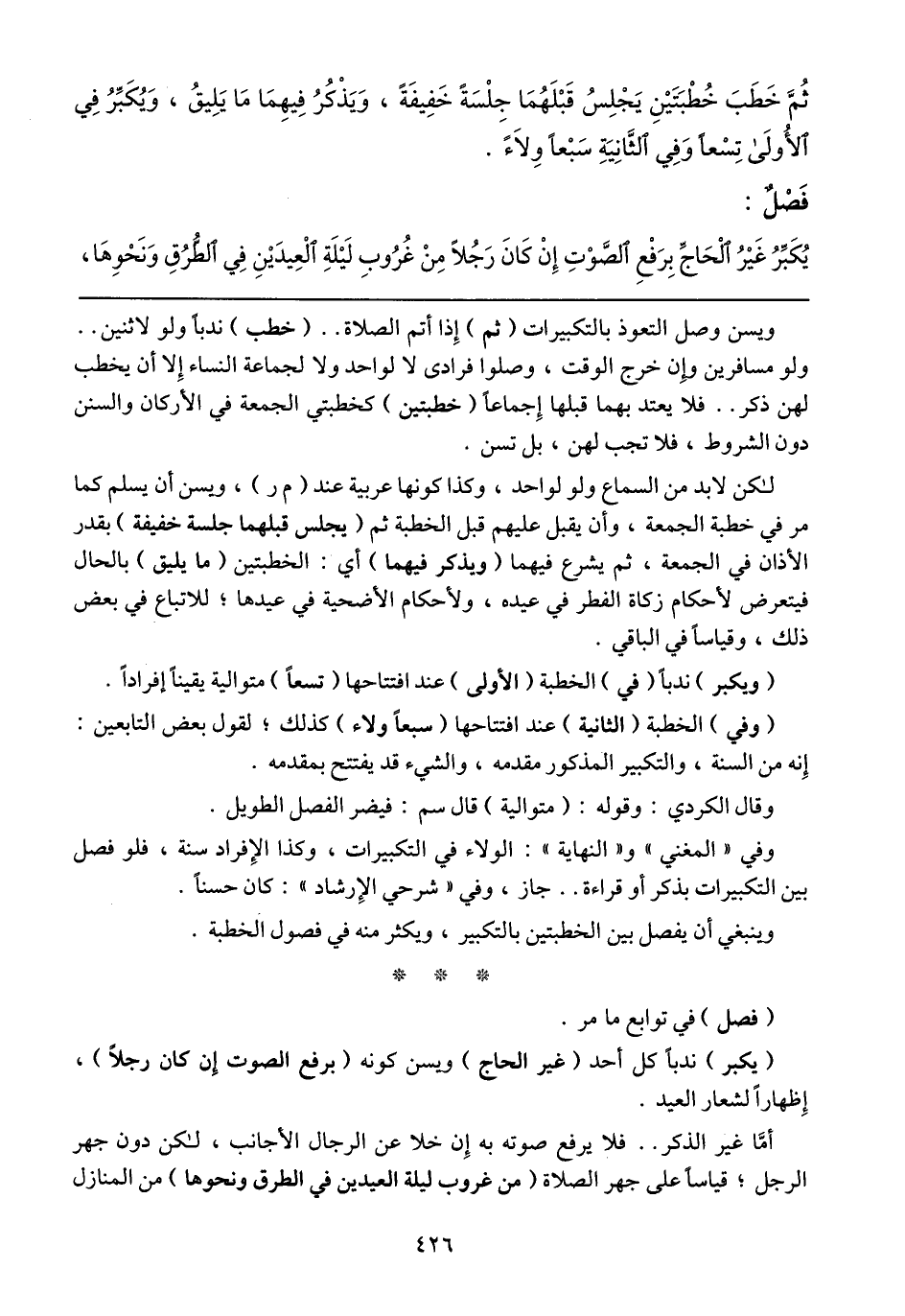 ويسن وصل التعوذ بالتكبيرات (ثم) إذا أتم الصلاة .. (خطب) ندباً ولو لاثنين .. ولو مسافرين وإن خرج الوقت، وصلوا فرادى لا لواحد ولا لجماعة النساء إلا أن يخطب لهن ذكر .. فلا يعتد بهما قبلها إجماعاً (خطبتين) كخطبتي الجمعة في الأركان والسنن دون الشروط، فلا تجب لهن، بل تسن.