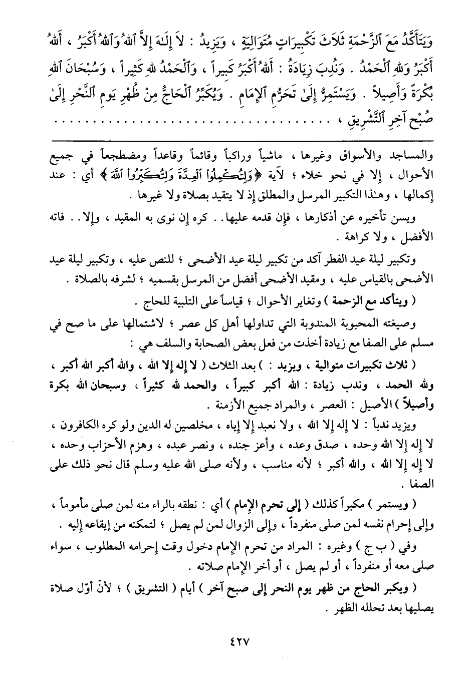(ثلاث تكبيرات متوالية، ويزيد:) بعد الثلاث (لا إله إلا الله، والله اكبر الله اكبر، ولله الحمد، وندب زيادة: الله أكبر كبيراً، والحمد لله كثيراً، وسبحان الله بكرة وأصيلاً) الأصيل: العصر، والمراد جميع الأزمنة.