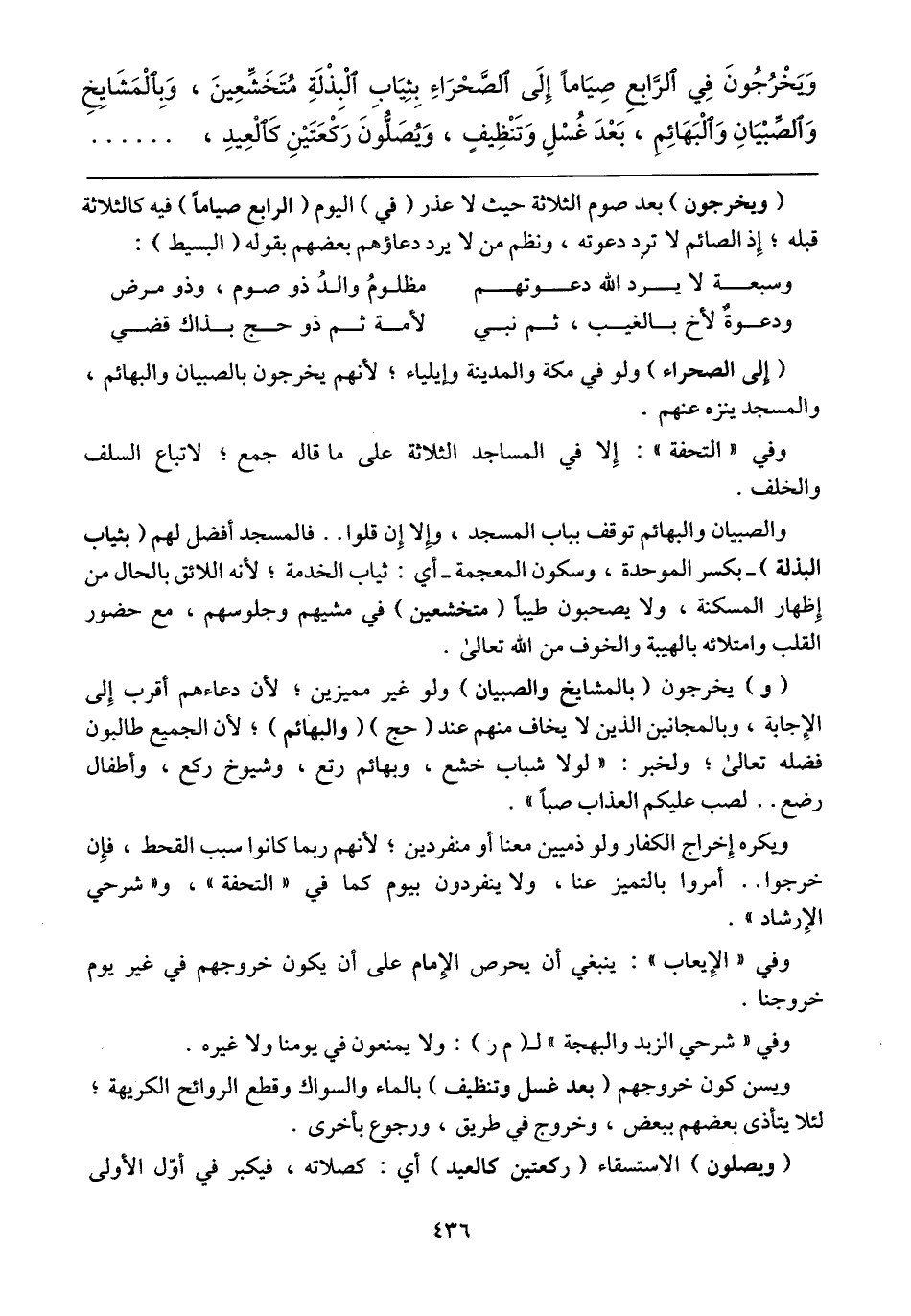 (إلى الصحراء) ولو في مكة والمدينة وايلياء؛ لأنهم يخرجون بالصبيان والبهائم، والمسجد ينزه عنهم.