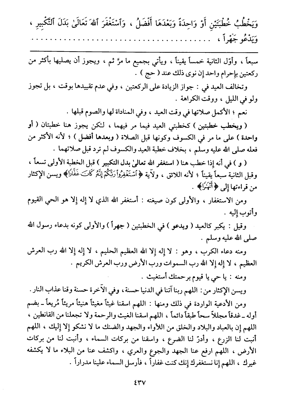 (و) في أنه إذا خطب هنا (استغفر الله تعالى بدل التكبير) قبل الخطبة الأولى تسعاً، وقبل الثانية سبعاً يقيناً؛ لأنه اللائق، ولآية (اسْتَغْفِرُوا رَبَّكُمْ إِنَّهُ كَانَ غَفَّاراً) [نوح:10] ويسن الإكثار من قراءتها إلى (أَنْهَاراً).