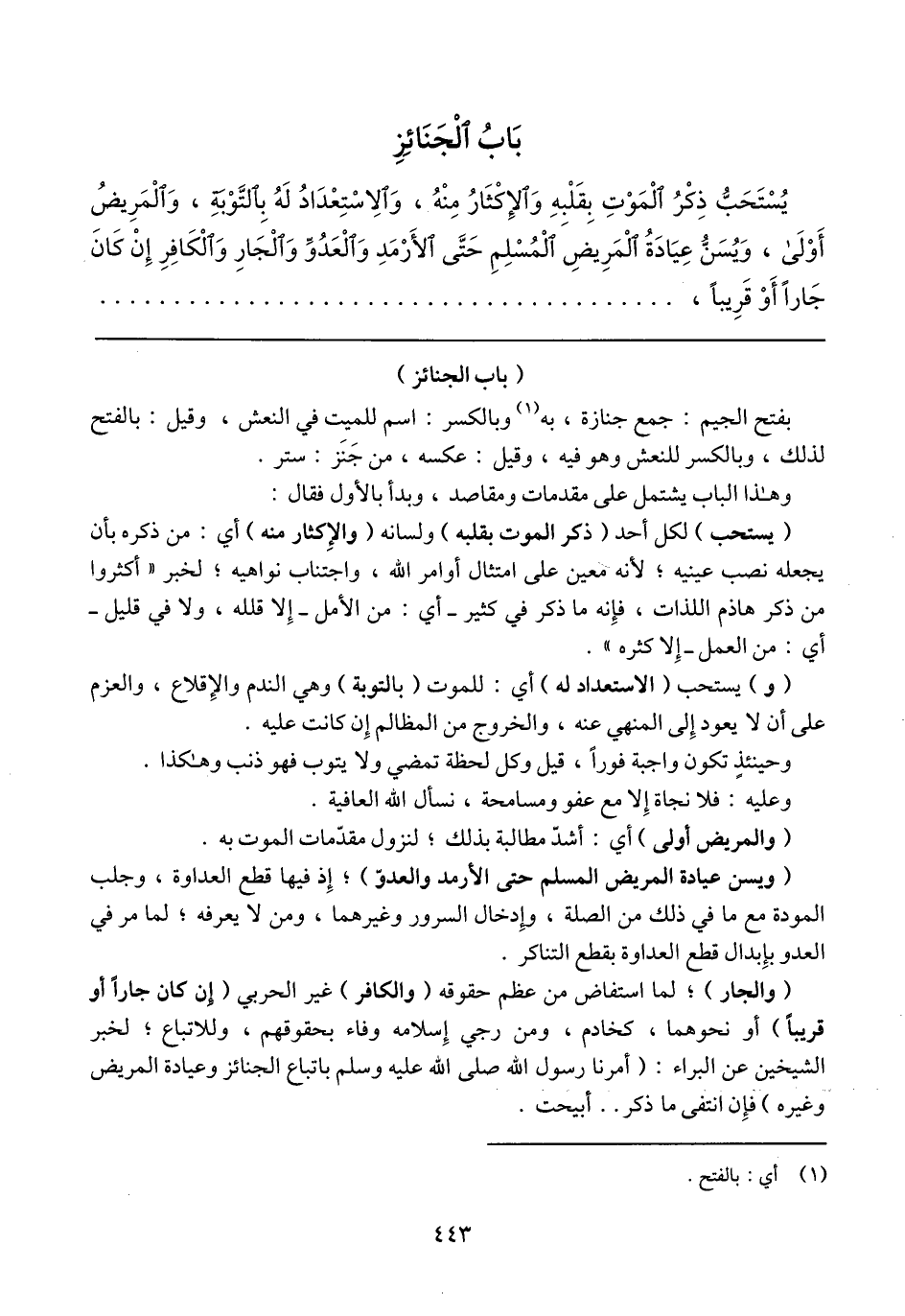 (يستحب) لكل أحد (ذكر الموت بقلبه) ولسانه (والإكثار منه) أي: من ذكره بأن يجعله نصب عينيه؛ لأنه معين على امتثال أوامر الله، واجتناب نواهيه؛ لخبر: "أكثروا من ذكر هاذم اللذات، فإنه ما ذكر في كثير -أي: من الأمل- إلا قلله، ولا في قليل -أي: من العمل- إلا كثره".