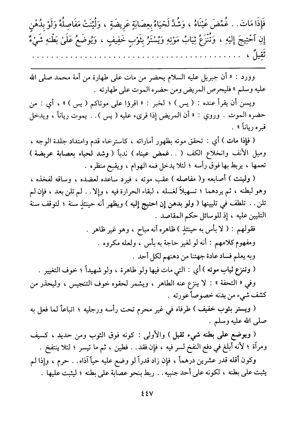 (فإذا مات) أي: تحقق موته بظهور أماراته، كاسترخاء قدم وامتداد جلدة الوجه، وميل الأنف وانخلاع الكف ( .. غمض عيناه) ندباً (وشد لحياه بعصابة عريضة) تعمها، يربط بها فوق رأسه؛ لئلا يدخل فمه الهوام، ويقبح منظره.