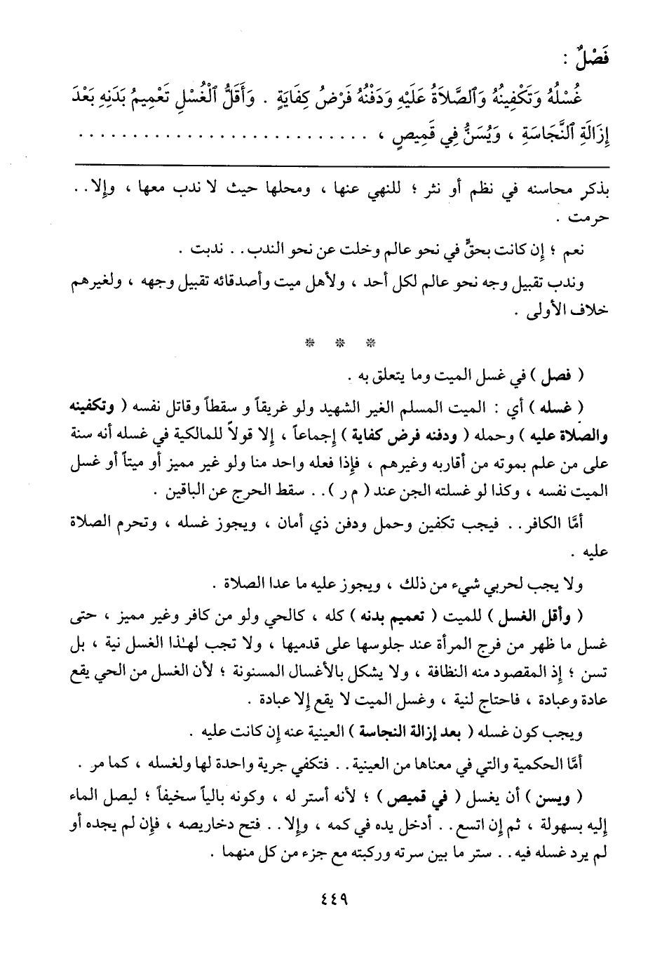 (غسله) أي: الميت المسلم الغير الشهيد ولو غريقاً وسقطاً وقاتل نفسه (وتكفينه والصلاة عليه) وحمله (ودفنه فرض كفاية) إجماعاً، إلا قولاً للمالكية في غسله أنه سنة على من علم بموته من أقاربه وغيرهم، فإذا فعله واحد منا ولو غير مميز أو ميتاً أو غسل الميت نفسه، وكذا لو غسلته الجن عند (م ر) .. سقط الحرج عن الباقين.