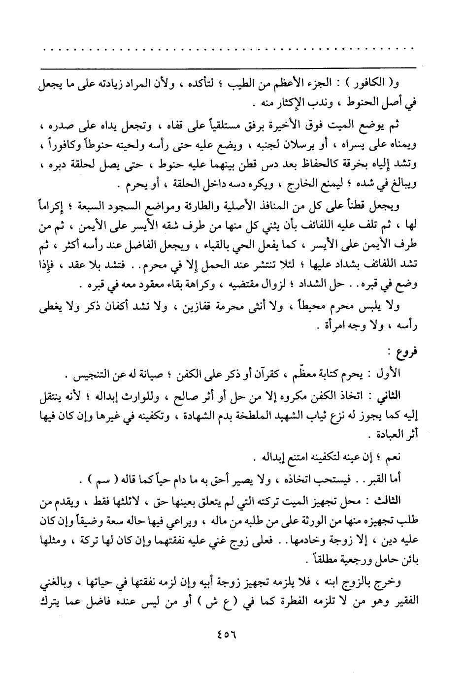 الثالث: محل تجهيز الميت تركته التي لم يتعلق بعينها حق، لا ثلثها فقط، ويقدم من طلب تجهيزه منها من الورثة على من طلبه من ماله، ويراعى فيها حاله سعة وضيقاً وإن كان عليه دين، إلا زوجة وخادمها .. فعلى زوج غني عليه نفقتهما وإن كان لها تركة، ومثلها بائن حامل ورجعية مطلقاً.