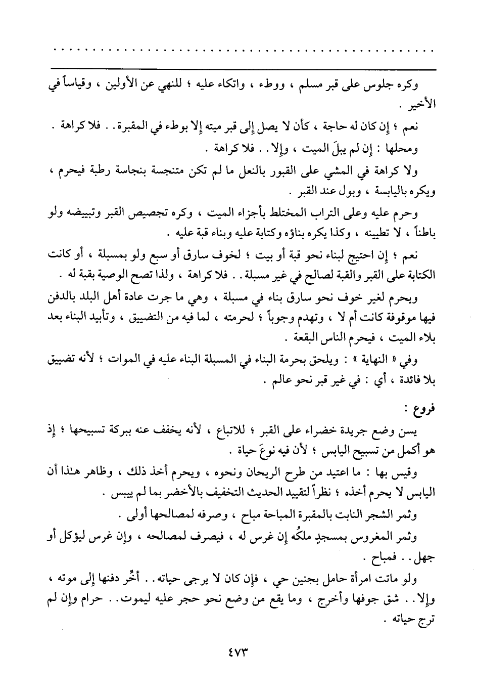 ولا كراهة في المشي على القبور بالنعل ما لم تكن متنجسة بنجاسة رطبة فيحرم، ويكره باليابسة، وبول عند القبر، وحرم عليه، وعلى التراب المختلط بأجزاء الميت، وكره تجصيص القبر وتبيضه ولو باطناً، لا تطيينه، وكذا يكره بناؤه وكتابة عليه وبناء قبة عليه.