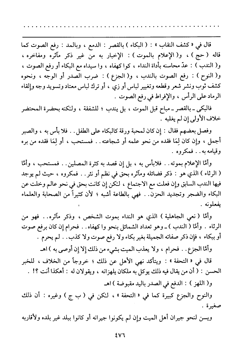 قال في "كشف النقاب": (البكاء) بالقصر: الدمع، وبالمد: رفع الصوت كما قاله (حج)، و (الإعلام بالموت): الإخبار به من غير ذكر مآثره ومفاخره، و (الندب): عد محاسنه بأداة النداء، كواكهفاه، واسيداه مع البكاء أو رفع الصوت، و (النوح): رفع الصوت بالندب، و (الجزع): ضرب الصدر أو الوجه، ونحوه كشف ثوب ونشر شعر وقطعه وتغيير لباس أو زي، أو ترك لباس معتاد وتسويد وجه وإلقاء الرماد على الرأس، والإفراط في رفع الصوت.