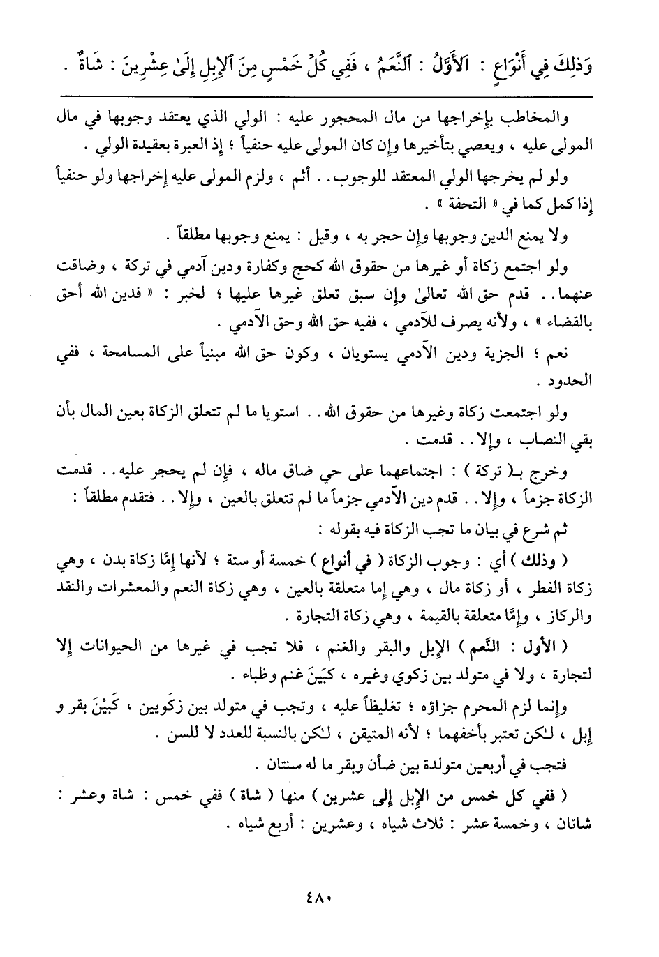 (الأول: النعم) الإبل والبقر والغنم، فلا تجب في غيرها من الحيوانات إلا لتجارة، ولا في متولد بين زكوي وغيره، كبين غنم وظباء.
