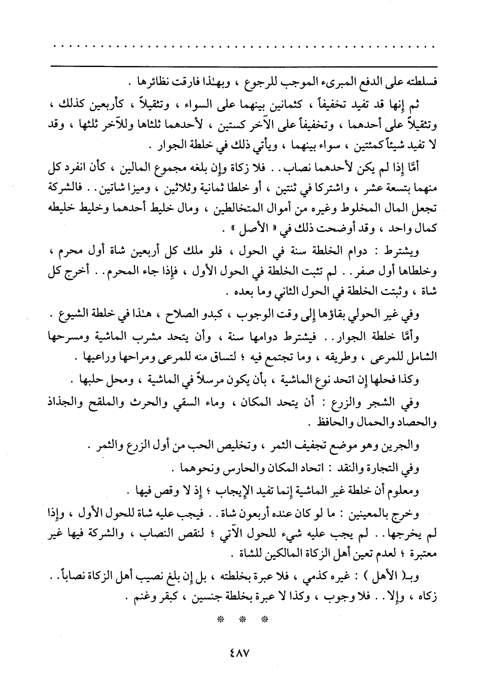 أمَّا إذا لم يكن لأحدهما نصاب .. فلا زكاة وإن بلغه مجموع المالين، كأن انفرد كل منهما بتسعة عشر، واشتركا في ثنتين، أو خلطا ثمانية وثلاثين، وميزا شاتين .. فالشركة تجعل المال المخلوط وغيره من أموال المتخالطين، ومال خليط أحدهما وخليط خليطة كمال واحد، وقد أوضحت ذلك في "الأصل".
