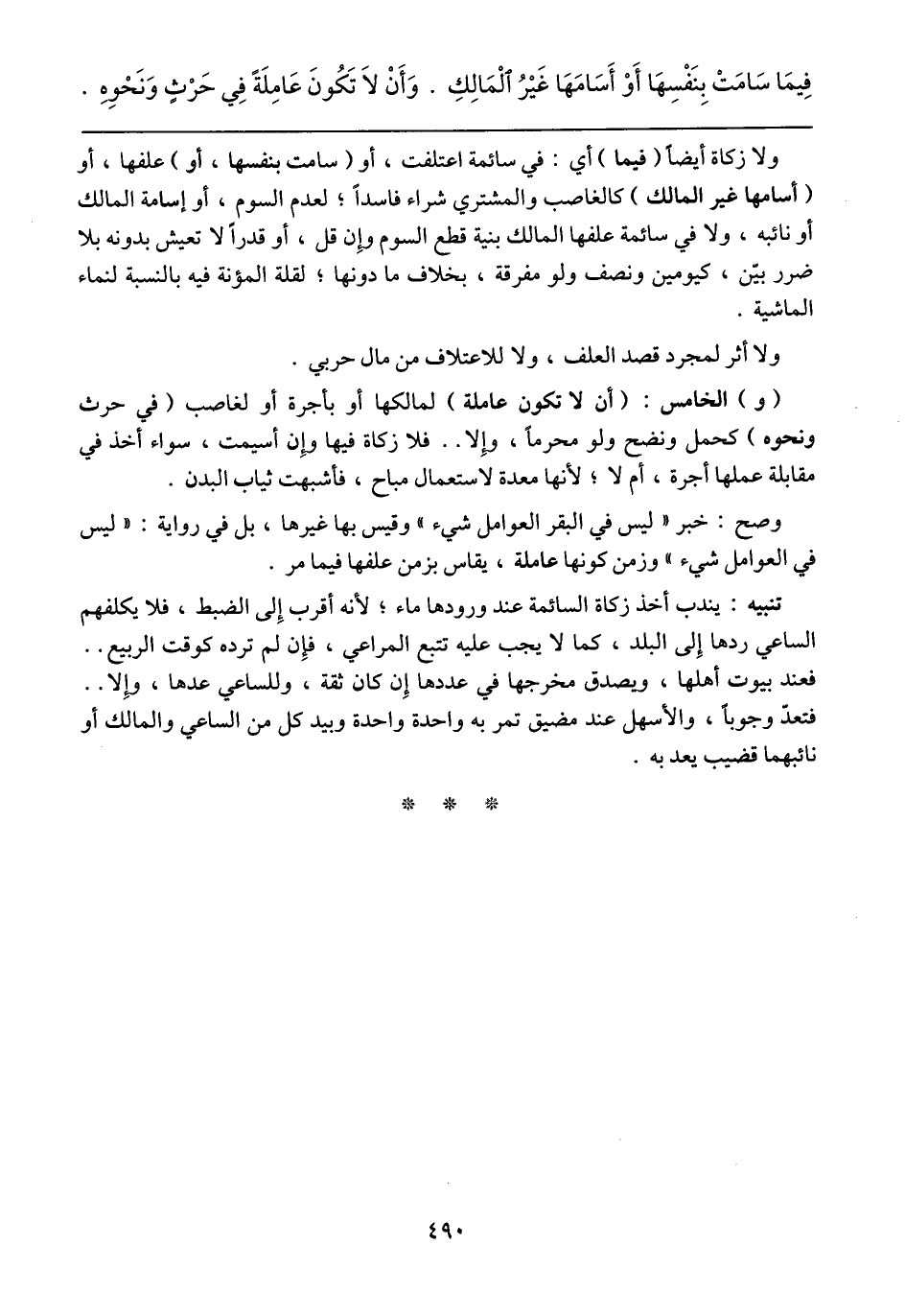 (و) الخامس: (أن لا تكون عاملة) لمالكها أو بأجرة أو لغاصب (في حرث ونحوه) كحمل ونضح ولو محرماً، وإلا .. فلا زكاة فيها وإن أسيمت، سواء أخذ في مقابلة عملها أجرة، أم لا؛ لأنها معدة لاستعمال مباح، فأشبهت ثياب البدن.
