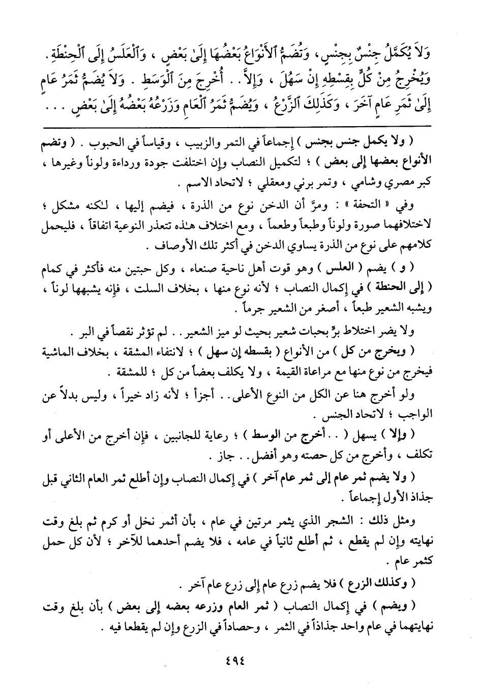 (وتضم الأنواع بعضها إلى بعض)؛ لتكميل النصاب وإن اختلفت جودة ورداءة ولوناً وغيرها، كبر مصري وشامي، وتمر برني ومعقلي؛ لاتحاد الاسم.