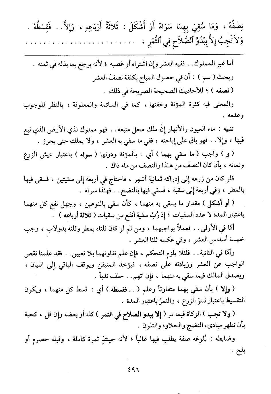 تنبيه: ماء العيون والأنهار إن ملك محل منبعه .. فهو مملوك لذي الأرض الذي نبع فيها، وإلا .. فهو باق على إباحته، ففي ما سقي به العشر، ولا يملك حتى يحرز.
