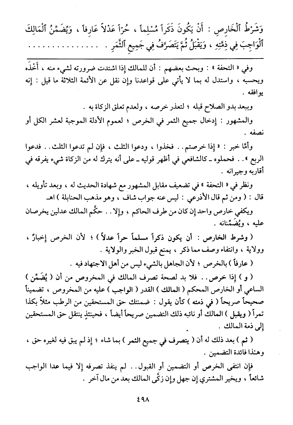 (وشرط الخارص: أن يكون ذكراً مسلماً حراً عدلاً)؛ لأن الخرص إخبارٌ، وولاية، وانتفاء وصف مما ذكر، يمنع قبول الخبر والولاية.