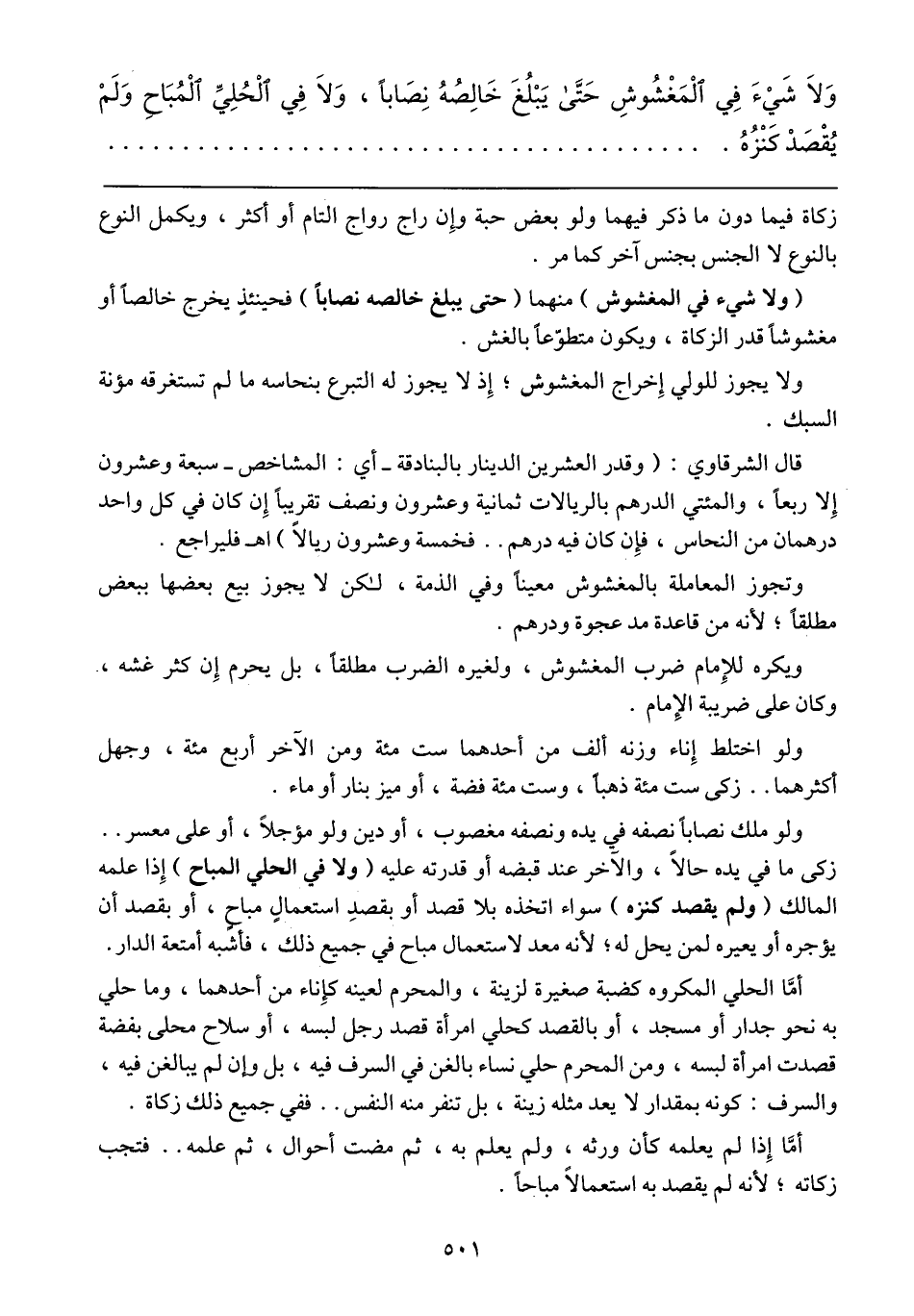 ولو ملك نصاباً نصفه في يده ونصفه مغصوب، أو دين ولو مؤجلاً، أو على معسر .. زكى ما في يده حالاً، والآخر عند قبضه أو قدرته عليه (ولا في الحلي المباح) إذا علمه المالك (ولم يقصد كنزه) سواء اتخذه بلا قصد أو بقصد استعمال مباحٍ، أو بقصد أن يؤجره أو يعيره لمن يحل له؛ لأنه معد لاستعمال مباح في جميع ذلك، فأشبه أمتعة الدار.