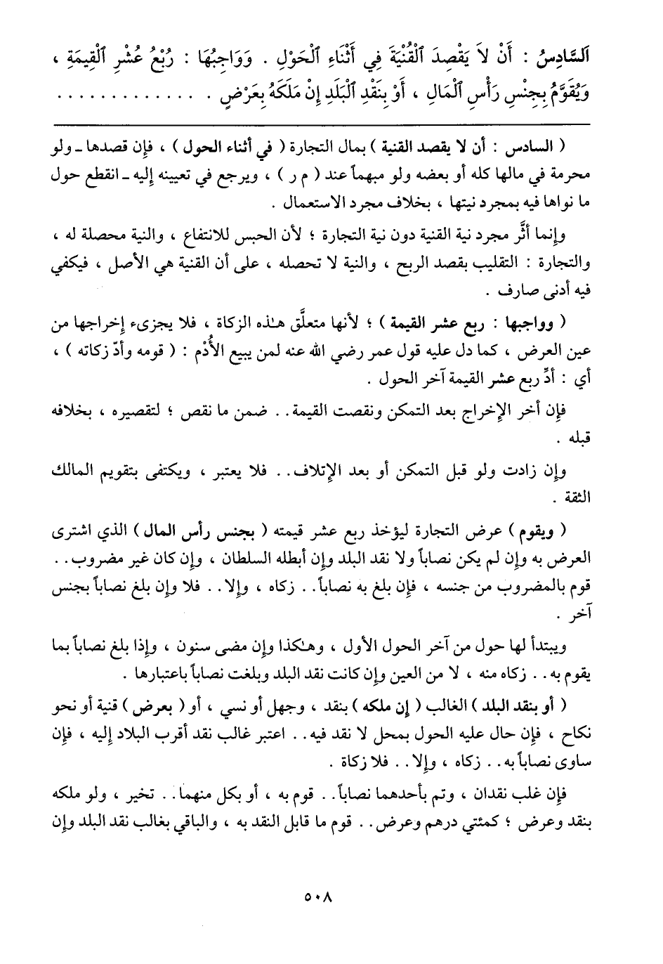(السادس: أن لا يقصد القنية) بمال التجارة (في أثناء الحول)، فإن قصدها -ولو محرمة في مالها كله أو بعضه ولو مبهماً عند (م ر)، ويرجع في تعينه إليه- انقطع حول ما نواها فيه بمجرد نيتها، بخلاف مجرد الاستعمال.