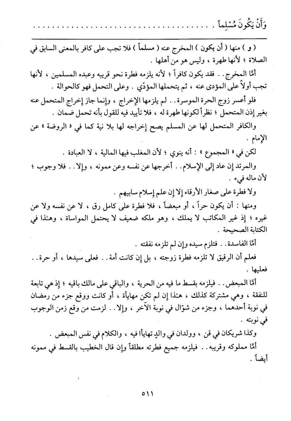 ومنها: أن يكون حراً، أو مبعضا، فلا فطرة على كامل رق، لا عن نفسه ولا عن غيره؛ إذ غير المكاتب لا يملك، وهو ملكه ضعيف لا يحتمل المواساة، وهذا في الكتابة الصحيحة.