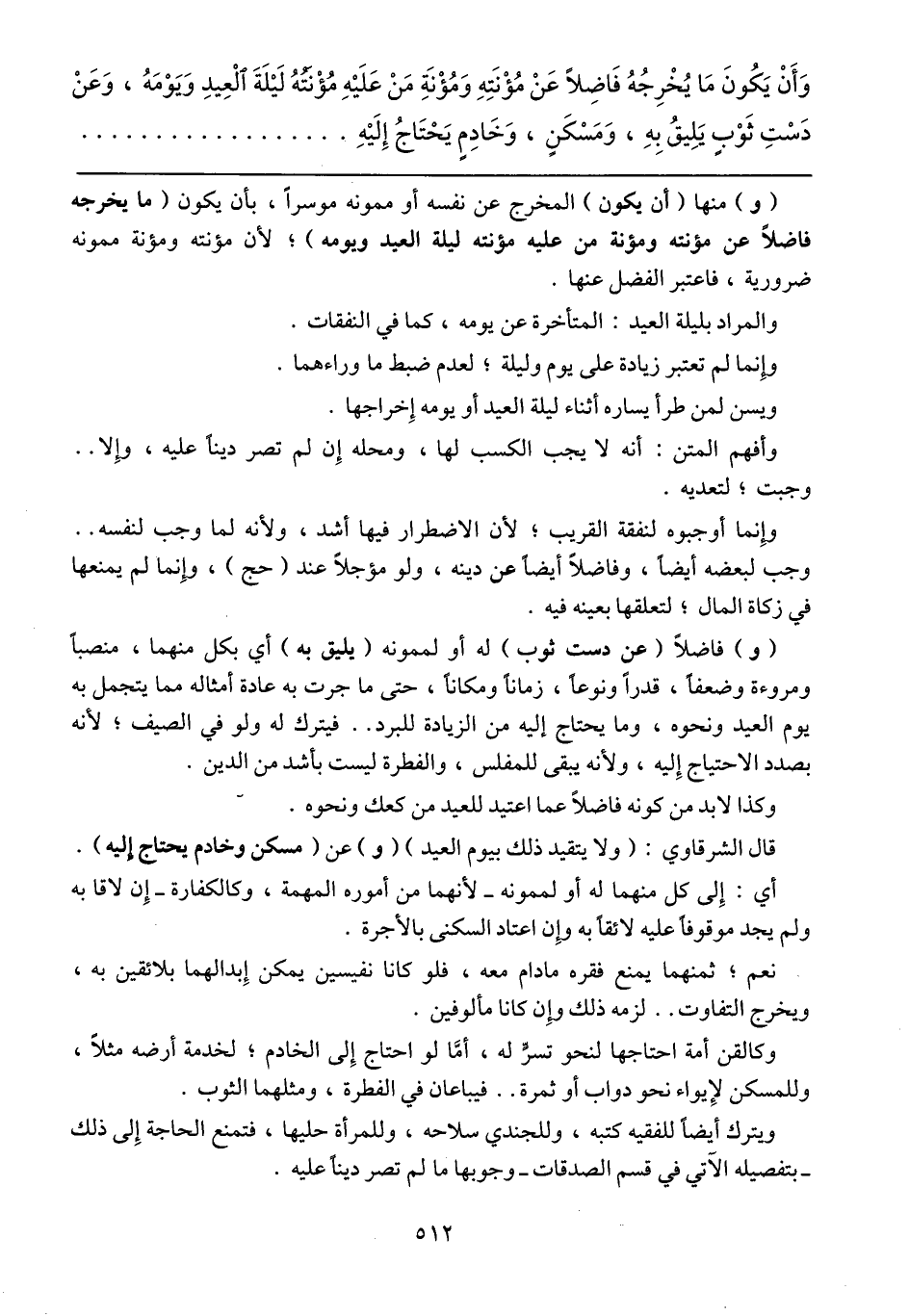 قال الشرقاوي: (ولا يتقيد ذلك بيوم العيد) (و) عن (مسكن وخادم يحتاج إليه).