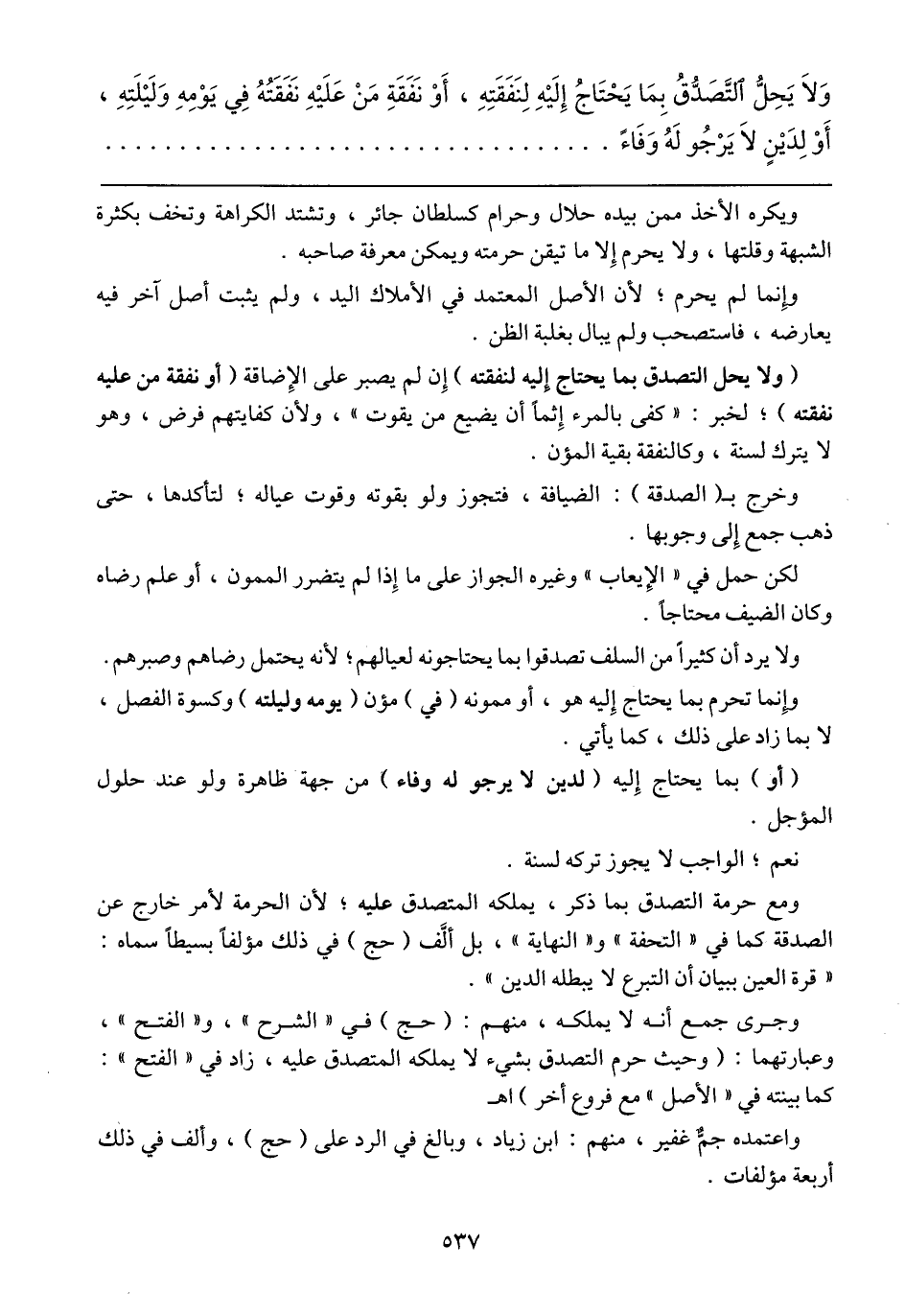 (ولا يحل التصدق بما يحتاج إليه لنفقته) إن لم يصبر على الإضاقة (أو نفقة من عليه نفقته)؛ لخبر: "كفى بالمرء إثماً أن يضيع من يقوت"، ولأن كفايتهم فرض، وهو لا يترك لسنة، وكالنفقة بقية المؤن.