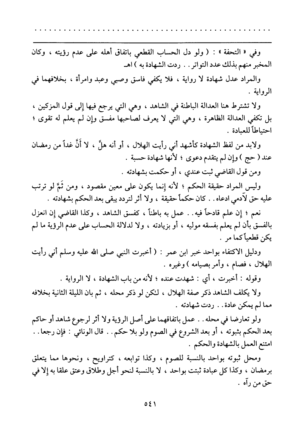 وفي "التحفة": (ولو دل الحساب القطعي باتفاق أهله على عدم رؤيته، وكان المخبر منهم بذلك عدد التواتر .. ردت الشهادة به) اهـ