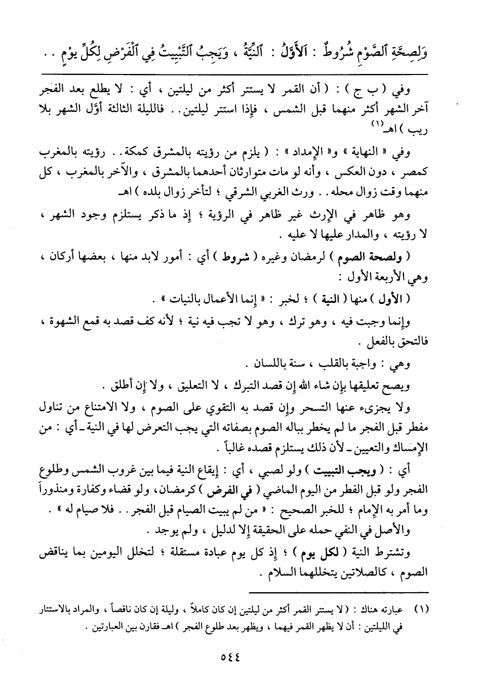 (ولصحة الصوم) لرمضان وغيره (شروط) أي: أمور لابد منها، بعضها أركان، وهي الأربعة الأول: