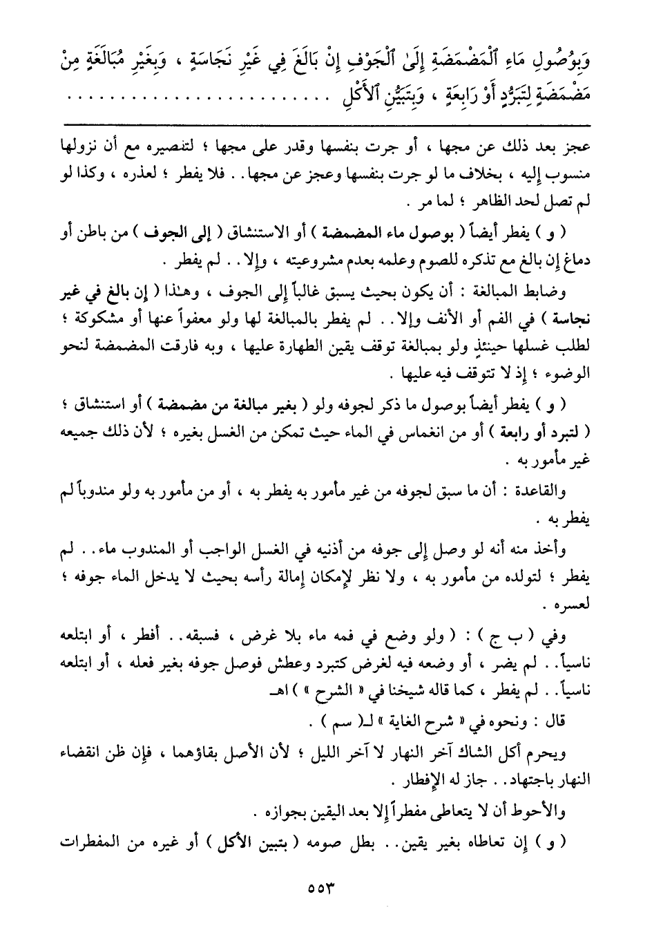 وضابط المبالغة: أن يكون بحيث يسبق غالباً إلى الجوف، وهذا (إن بالغ في غير نجاسة) في الفم أو الأنف وإلا .. لم يفطر بالمبالغة لها ولو معفواً عنها أو مشكوكة؛ لطلب غسلها حينئذٍ ولو بمبالغة توقف يقين الطهارة عليها، وبه فارقت المضمضة لنحو الوضوء، إذ لا تتوقف فيه عليها.