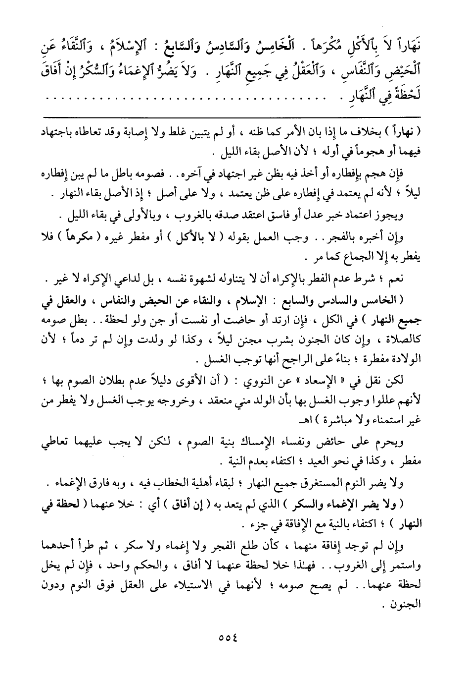 (الخامس والسادس والسابع: الإسلام، والنقاء عن الحيض والنفاس، والعقل في جميع النهار) في الكل، فإن ارتد أو حاضت أو نفست أو جن ولو لحظة .. بطل صومه كالصلاة، وإن كان الجنون بشرب مجنن ليلاً، وكذا لو ولدت وإن لم تر دماً؛ لأن الولادة مفطرة؛ بناءً على الراجح أنها توجب الغسل.
