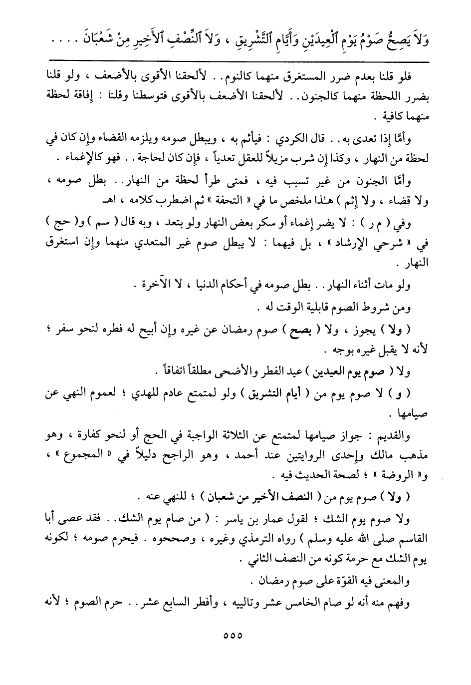 ولا صوم يوم الشك؛ لقول عمار بن ياسر: (من صام يوم الشك .. فقد عصى أبا القاسم صلى الله عليه وسلم) رواه الترمذي وغيره، وصححوه. فيحرم صومه؛ لكونه يوم الشك مع حرمة كونه من النصف الثاني.
