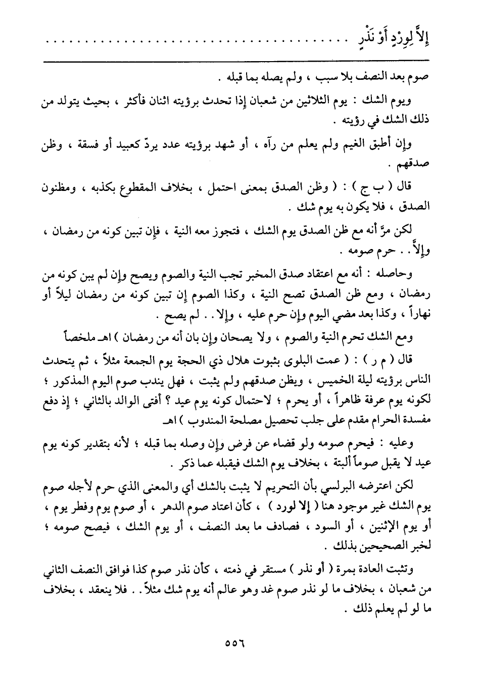 لكن اعترضه البرلسي بأن التحريم لا يثبت بالشك أي والمعنى الذي حرم لأجله صوم يوم الشك غير موجود هنا (إلا لورد)، كأن اعتاد صوم الدهر، أو صوم يوم وفطر يوم، أو يوم الإثنين، أو السود، فصادف ما بعد النصف، أو يوم الشك، فيصح صومه؛ لخبر الصحيحين بذلك.