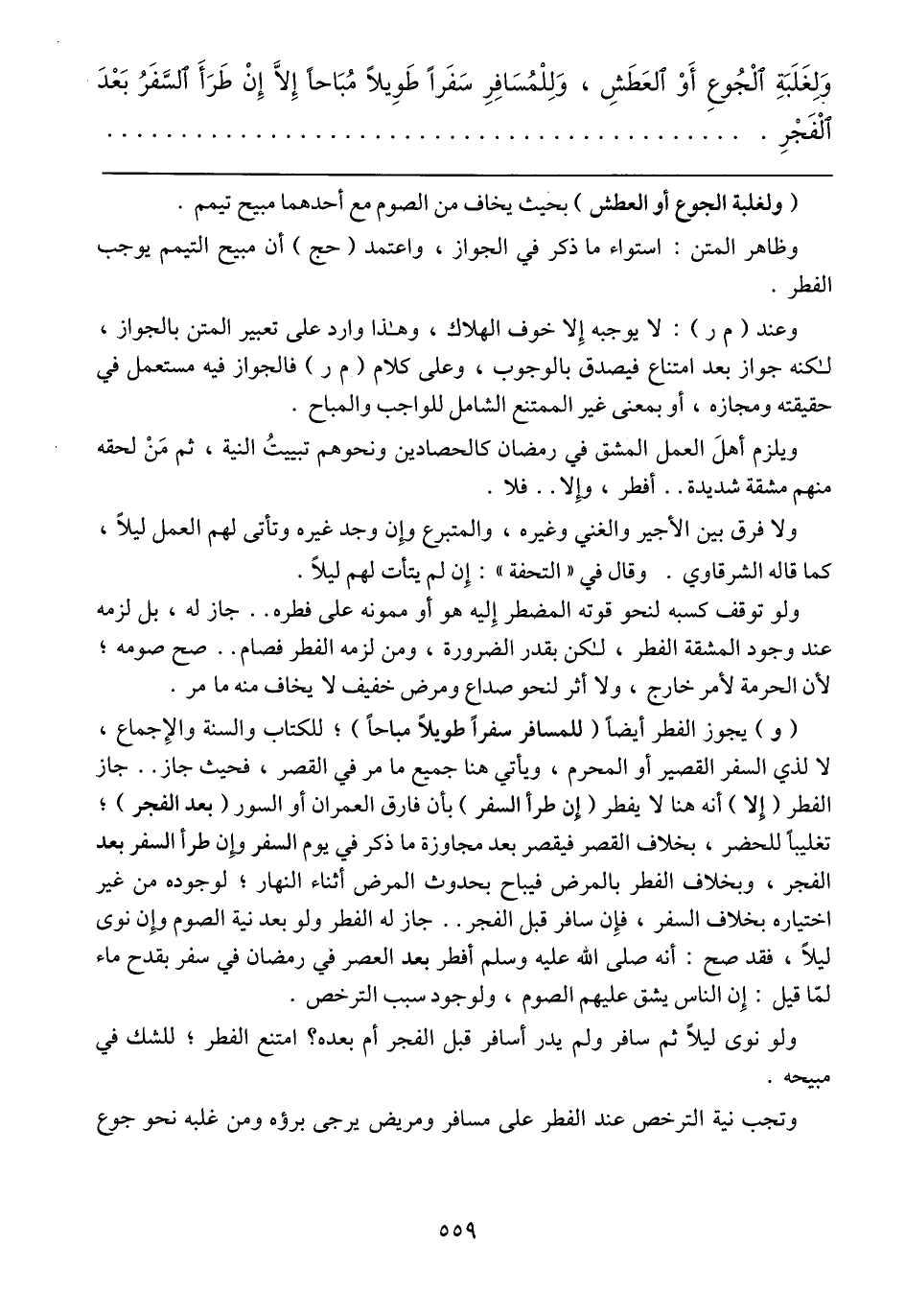 (و) يجوز الفطر أيضاً (للمسافر سفراً طويلاً مباحاً)؛ للكتاب والسنة والإجماع، لا لذي السفر القصير أو المحرَّم، ويأتي هنا جميع ما مر في القصر، فحيث جاز .. جاز الفطر (إلا) أنه هنا لا يفطر (إن طرأ السفر) بأن فارق العمران أو السور (بعد الفجر)؛ تغليباً للحضر، بخلاف القصر فيقصر بعد مجاوزة ما ذكر في يوم السفر وإن طرأ السفر بعد الفجر، وبخلاف الفطر بالمرض فيباح بحدوث المرض أثناء النهار؛ لوجوده من غير اختياره بخلاف السفر، فإن سافر قبل الفجر .. جاز له الفطر ولو بعد نية الصوم وإن نوى ليلاً، فقد صح: أنه صلى الله عليه وسلم أفطر بعد العصر في رمضان في سفر بقدح ماء لمّا قيل: إن الناس يشق عليهم الصوم، ولوجود سبب الترخيص.