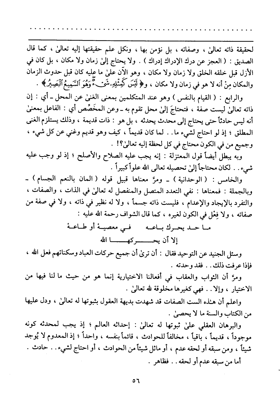 والخامس: (الوحدانية) -ومرَّ معناها قبيل قوله (المان بالنعم الجسام) - وبالجملة: فمعناها: نفي التعدد المتصل والمنفصل له تعالى في الذات، والصفات، والتفرد بالإيجاد والإعدام، فليست ذاته جسماً، ولا له نظير في ذاته، ولا في صفة من صفاته، ولا فِعْل في الكون لغيره، كما قال الشواف رحمة الله عليه: