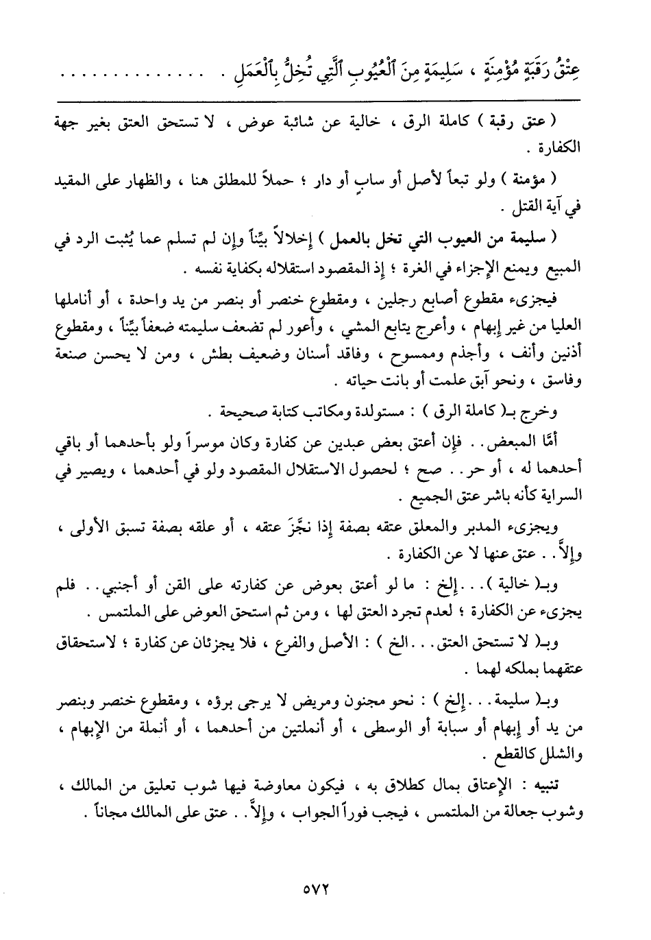 وبـ (سليمة ... إلخ): نحو مجنون ومريض لا يرجى برؤه، ومقطوع خنصر وبنصر من يد أو إبهام أو سبابة أو الوسطى، أو أنملتين من أحدهما، أو أنملة من الإبهام، والشلل كالقطع.