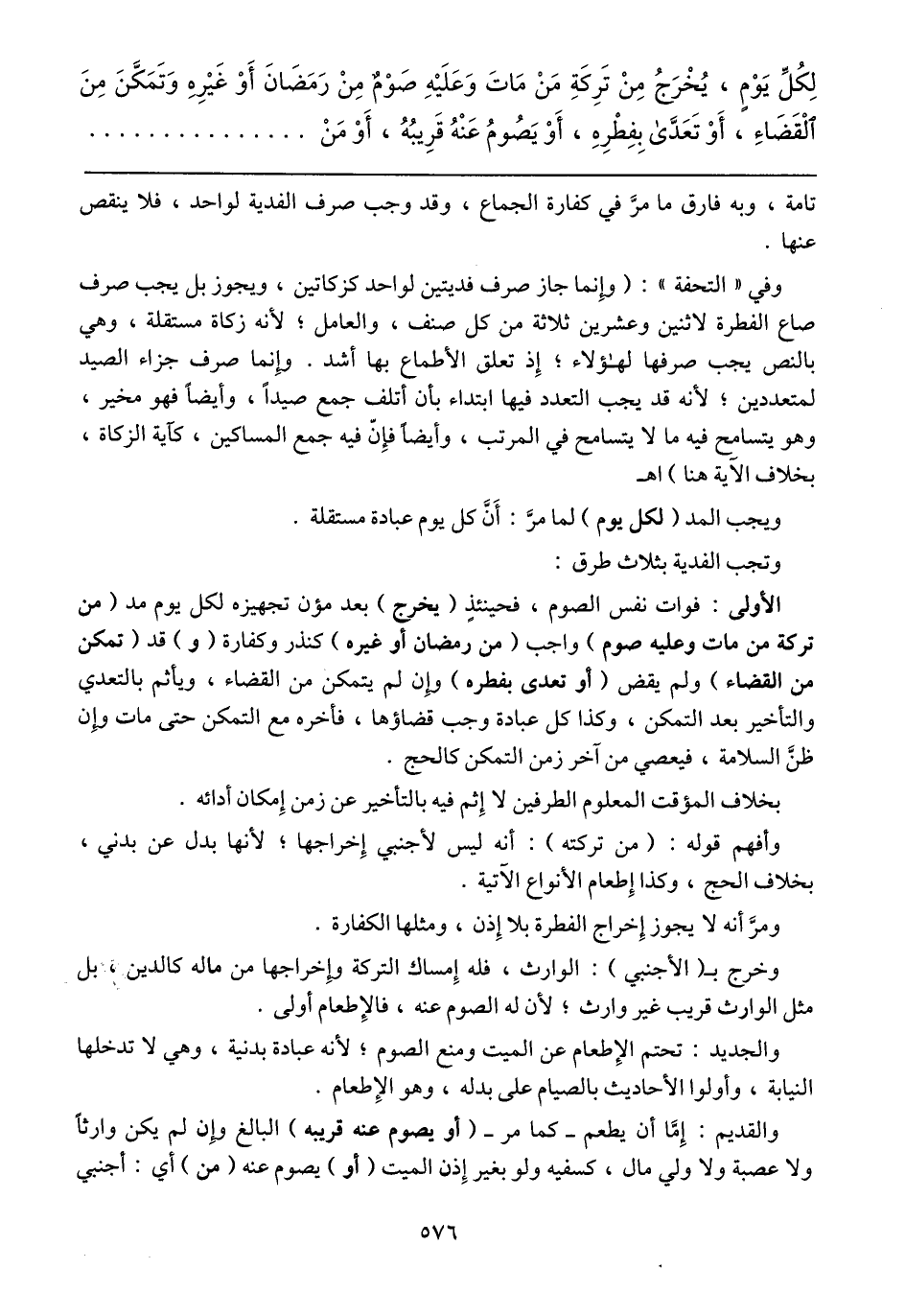 الأولى: فوات نفس الصوم، فحينئذٍ (يخرج) بعد مؤن تجهيزه لكل يوم مد (من تركه من مات وعليه صوم) واجب (من رمضان أو غيره) كنذر وكفارة (و) قد (تمكن من القضاء) ولم يقض (أو تعدى بفطره) وإن لم يتمكن من القضاء، ويأثم بالتعدي والتأخير بعد التمكن، وكذا كل عبادة وجب قضاؤها، فأخره مع التمكن حتى مات وإن ظنَّ السلامة، فيعصي من آخر زمن التمكن كالحج.
