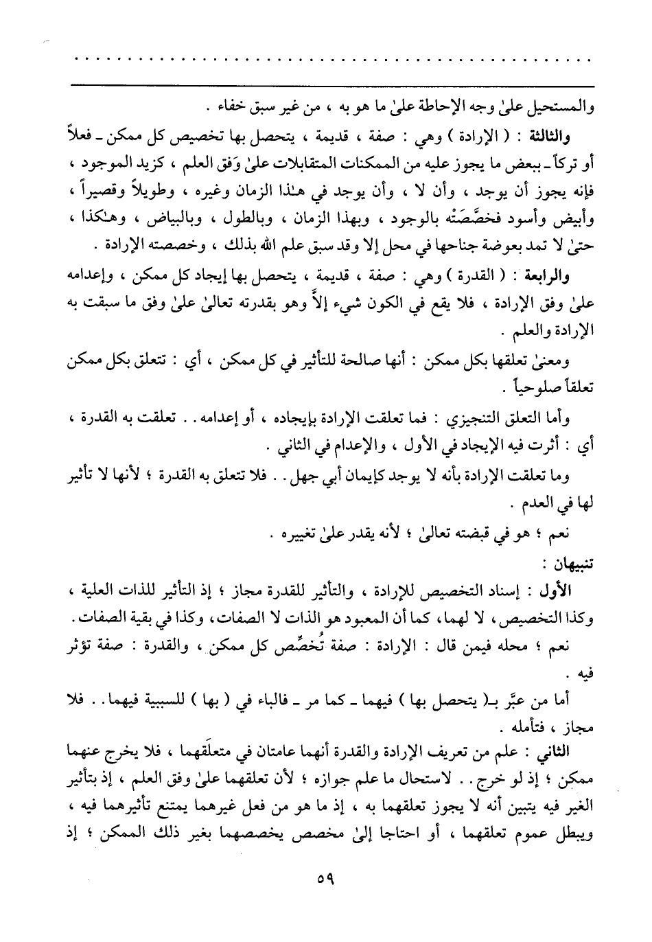والثالثة: (الإرادة) وهي: صفة، قديمة، يتحصل بها تخصيص كل ممكن -فعلاً أو تركاً- ببعض ما يجوز عليه من الممكنات المتقابلات على وَفق العلم، كزيد الموجود، فإنه يجوز أن يوجد، وأن لا، وأن يوجد في هذا الزمان وغيره، وطويلاً وقصيراً، وأبيض وأسود فخصصته بالوجود، وبهذا الزمان، وبالطول، وبالبياض، وهكذا، حتى لا تمد بعوضة جناحها في محل إلا وقد سبق علم الله بذلك، وخصصته الإرادة.