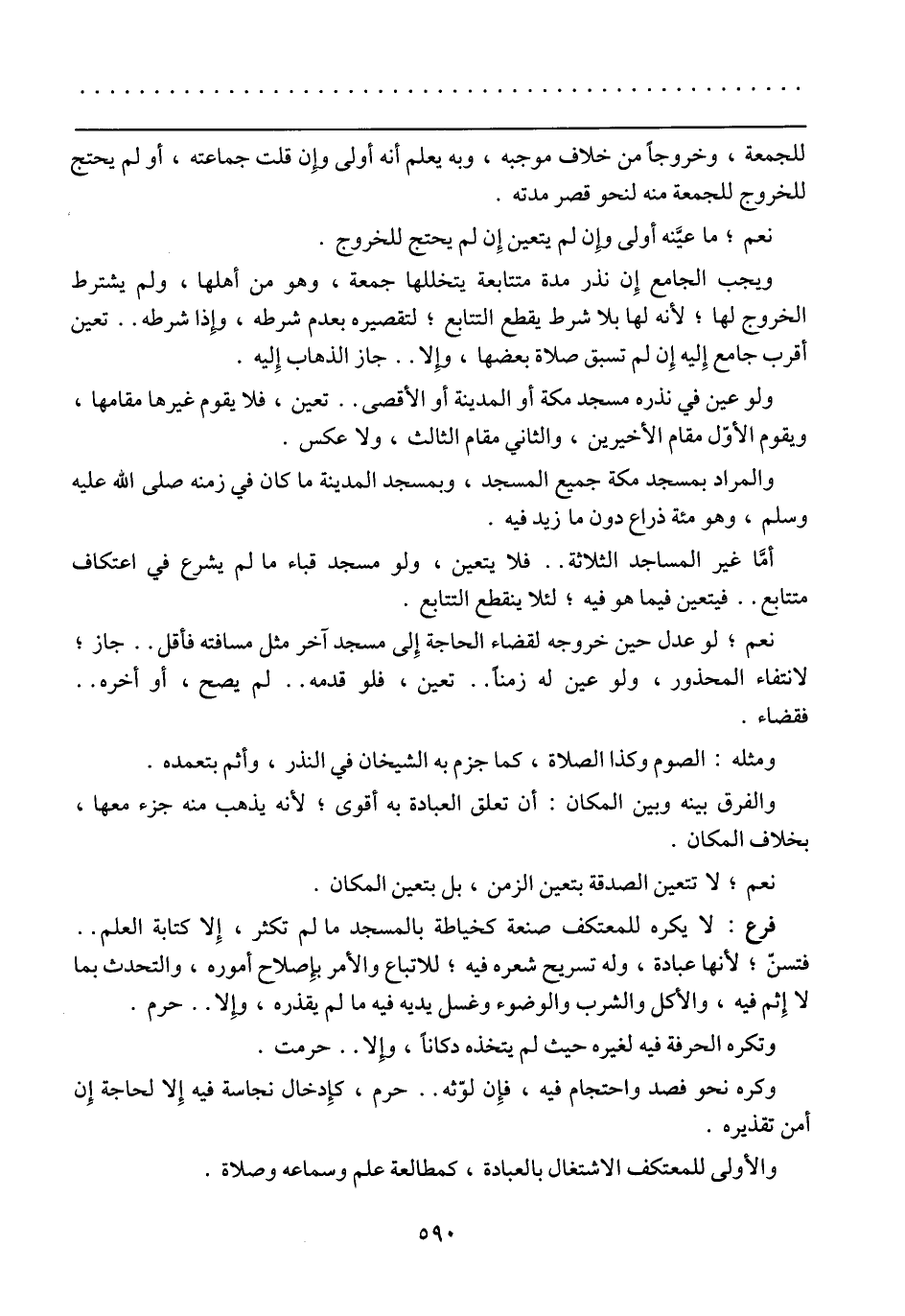 ويجب الجامع إن نذر مدة متتابعة يتخللها جمعة، وهو من أهلها، ولم يشترط الخروج لها؛ لأنه لها شرط يقطع التتابع؛ لتقصيره بعدم شرطه، وإذا شرطه .. تعين أقرب جامع إليه إن لم تسبق صلاة بعضها، وإلا .. جاز الذهاب إليه.