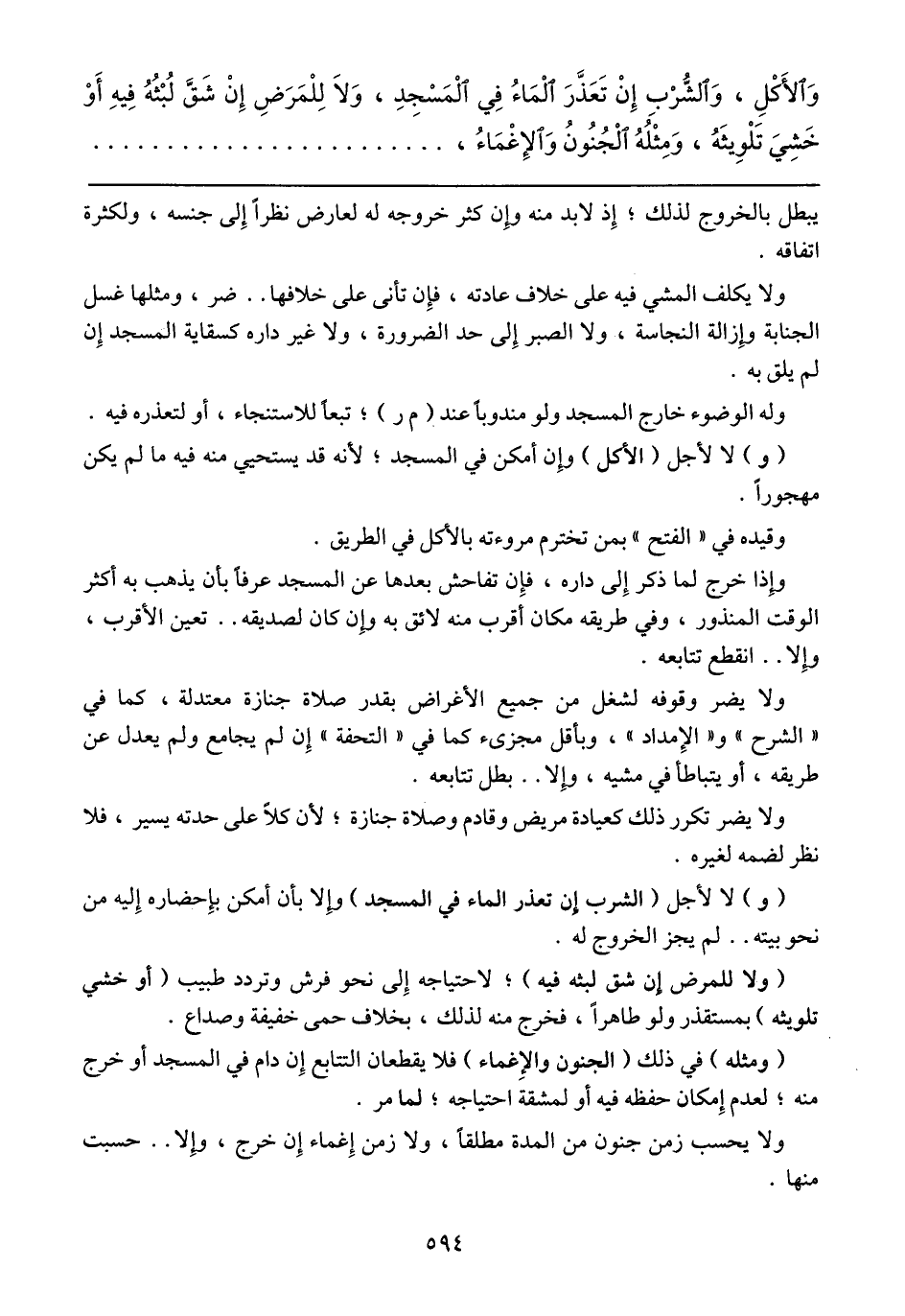 (ومثله) في ذلك (الجنون والإغماء) فلا يقطعان التتابع إن دام في المسجد أو خرج منه؛ لعدم إمكان حفظه فيه أو لمشقة احتياجه؛ لما مر.
