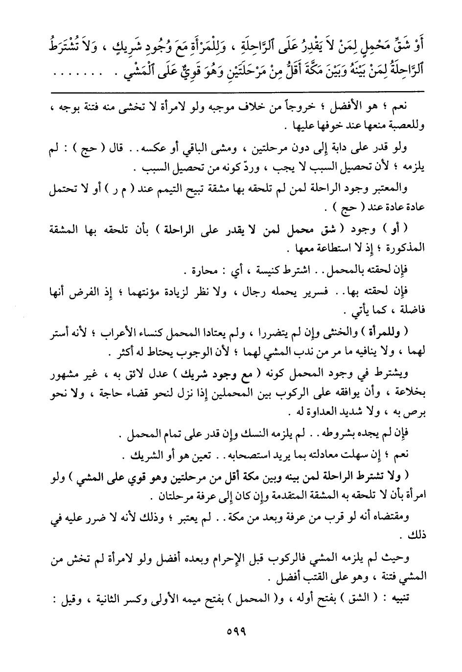 (وللمرأة) والخنثى وإن لم يتضررا، ولم يعتادا المحمل كنساء الأعراب؛ لأنه أستر لهما، ولا ينافيه ما مر من ندب المشي لهما؛ لأن الوجوب يحتاط له أكثر.